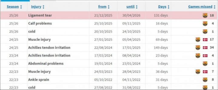 在2025/26赛季,遭遇感冒、小腿伤病和韧带撕裂,预计缺席152天,预计错过23场比赛。