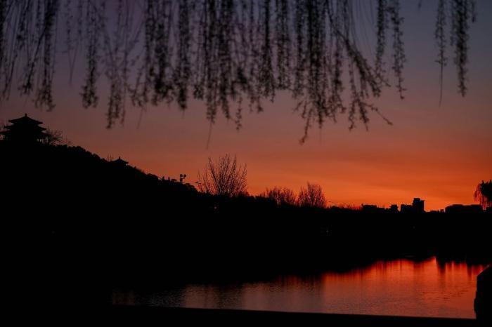 刚抽芽的柳条在红彤彤的晨光中轻飘。